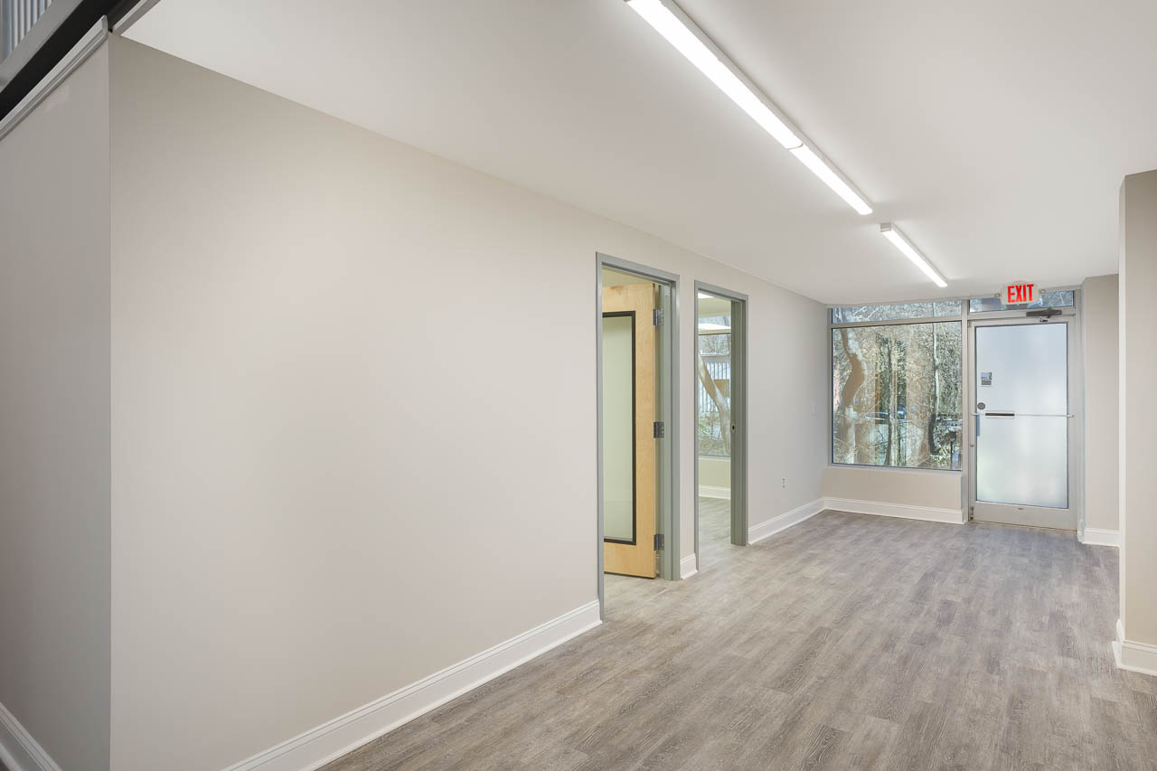Flex Space with four (4) individual office spaces with walk-up steps open office mezzanine or storage approx. 22’ x 19’ with height ceiling of 7’ 1” feet (lowest point) and 7’ 6” (at highest point).